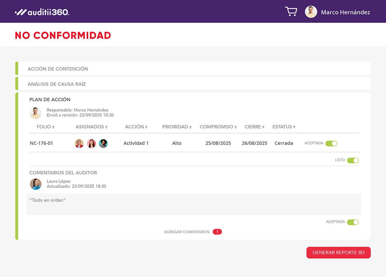 El sistema envía recordatorios automáticos, facilita el análisis de causa raíz con herramientas y diagramas, exporta reportes 8Ds listos para tu auditor y así transformas cada no conformidad en una mejora tangible.